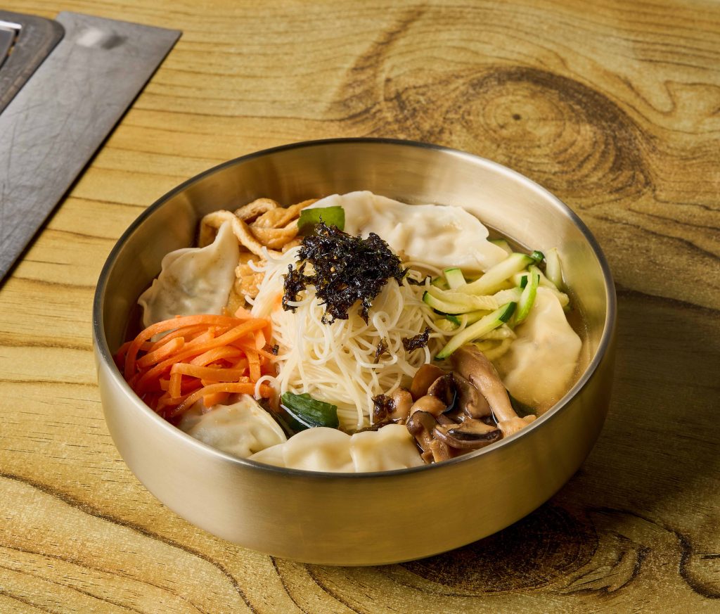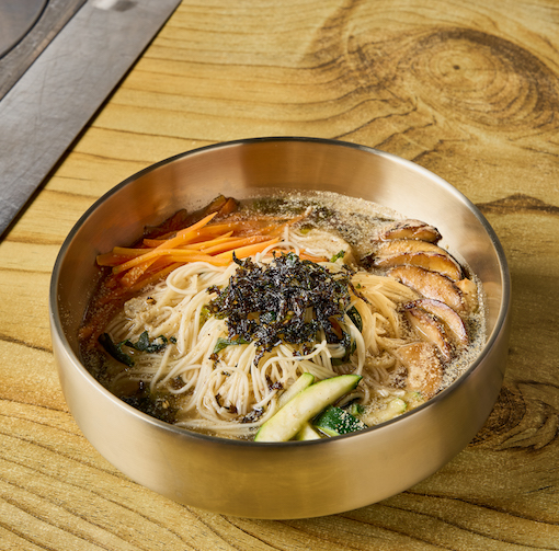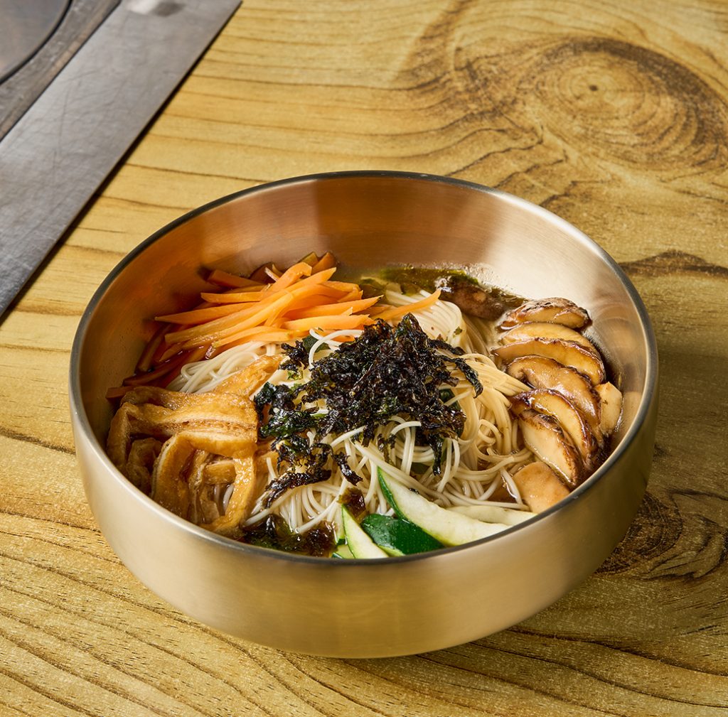In Korea, “Janchi” means feast, and this noodle soup lives up to its name. Long, silky wheat noodles swim in a deep, natural umami broth. Each bowl is topped with seasoned vegetables and mushrooms, adding layers of texture and flavor. Light and nourishing.